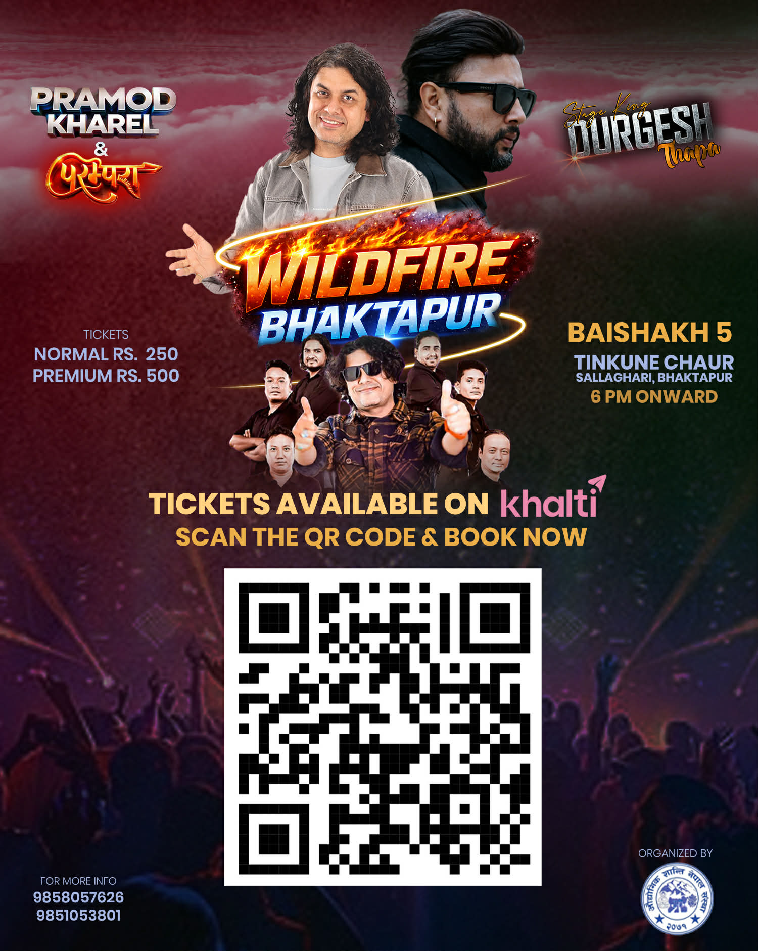 भक्तपुर, ४ बैशाख : नयाँवर्ष २०८३ सालको अवसरमा भोली शनिवार प्रमोद खरेल एण्ड परम्परा ब्याण्ड र दुर्गेश थापाको प्रस्तुती एकै मञ्चमा हेर्न पाइने भएको छ । भक्तपुरको सल्लाघारीस्थित १०९ रोपनी चौरमा आयोजना भइरहेको ‘दशौं भक्तपुर औद्योगिक, सांस्कृतिक, पर्यटन, कृषि तथा व्यापार महोत्सवमा आयोजक औद्योगिक शान्ति नेपाल संस्थाले आयोजना गर्ने भक्तपुर वाइल्ड फायर नाइटमा चर्चित गायकहरुको दमदार प्रस्तुतीलाई दर्शकहरुले अगाडिबाटै नियाल्न पाउने भएका हुन् ।